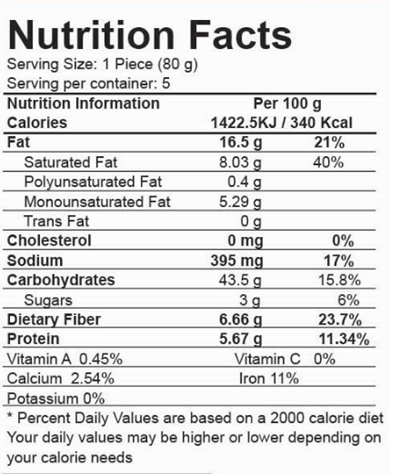 Ingredients: Wheat Flour (Gluten), water, Margarine ( Refined Palm Oil, Water, Admul ( Emulsifiers), Soy Lecithin, Beta Carotene (E160a), citric acid (E330), Potassium Sorbate (E200), Nature-identical butter flavor, Vitamin (A&D3), sugar, salt, Leavening agent (E500) and Permitted Preservative